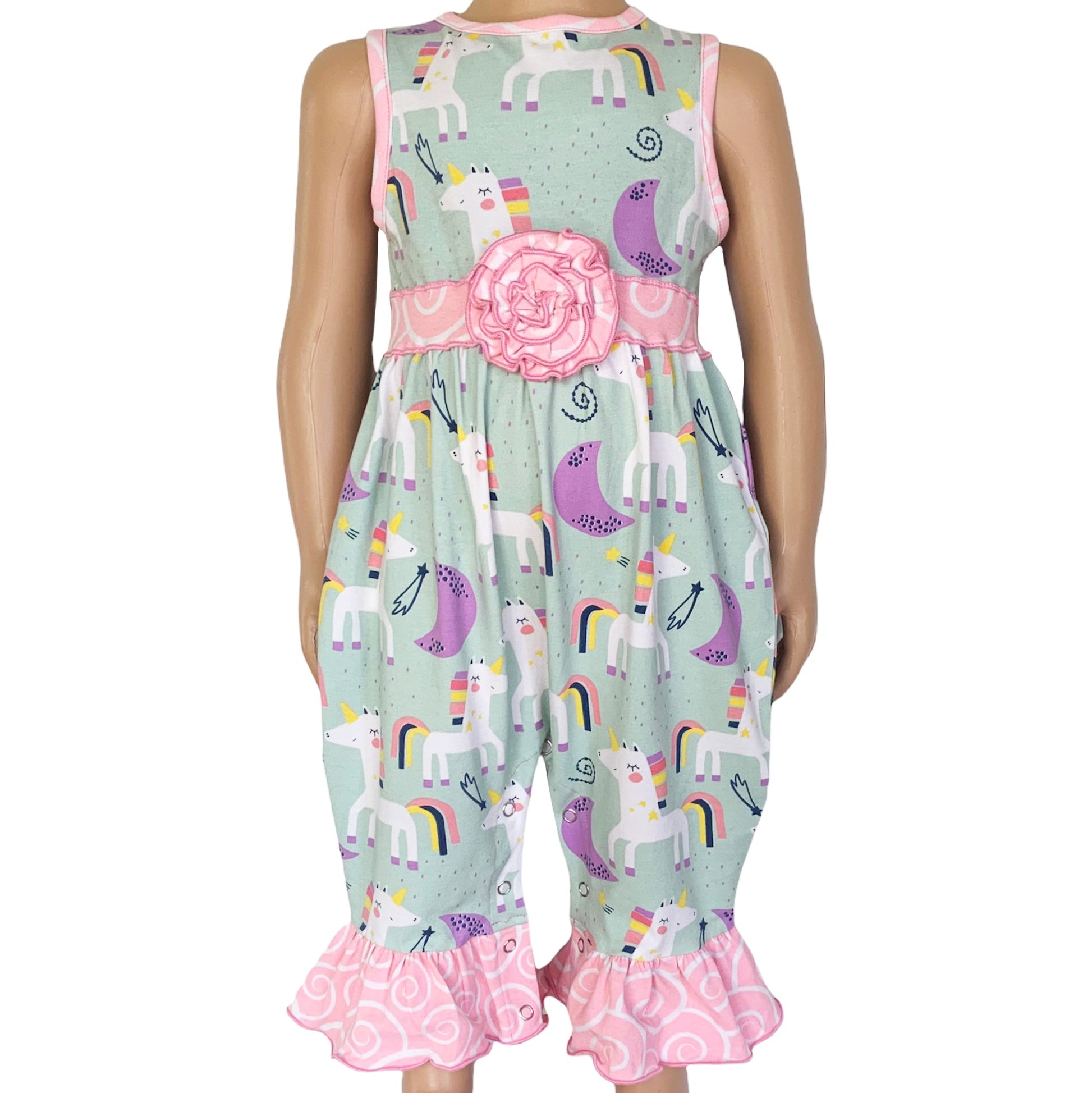 AnnLoren Magical Unicorns and Rainbow Baby Girls Romper. Features Original Unicorn print straight from Fairy Land. This will certainly be a favorite. Light Blue/Grey background and all the colors of the rainbow. Rose applique at waist. Sleeveless romper with snap closures behind neckline and crotch. Finished with gathered Pink Swirl ruffles at ankles. Made with Soft and Stretchy 95% Egyptian Cotton 5% Spandex Knit. Machine Washable.