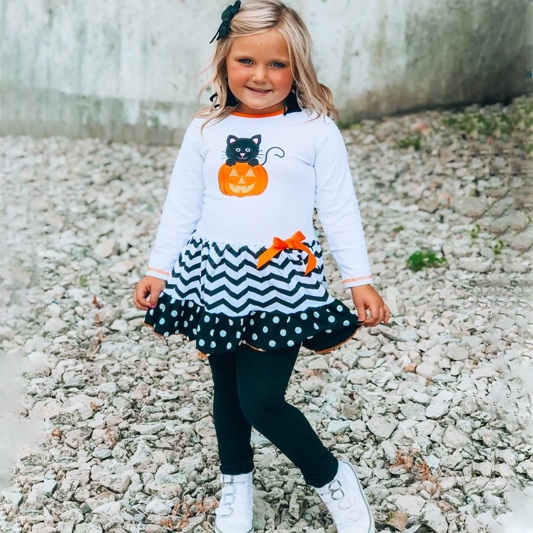 - The long-sleeved top is primarily white with adorable orange accents at the collar and sleeve cuffs, featuring a cute black cat sitting inside a carved pumpkin, bringing a delightful Halloween vibe.