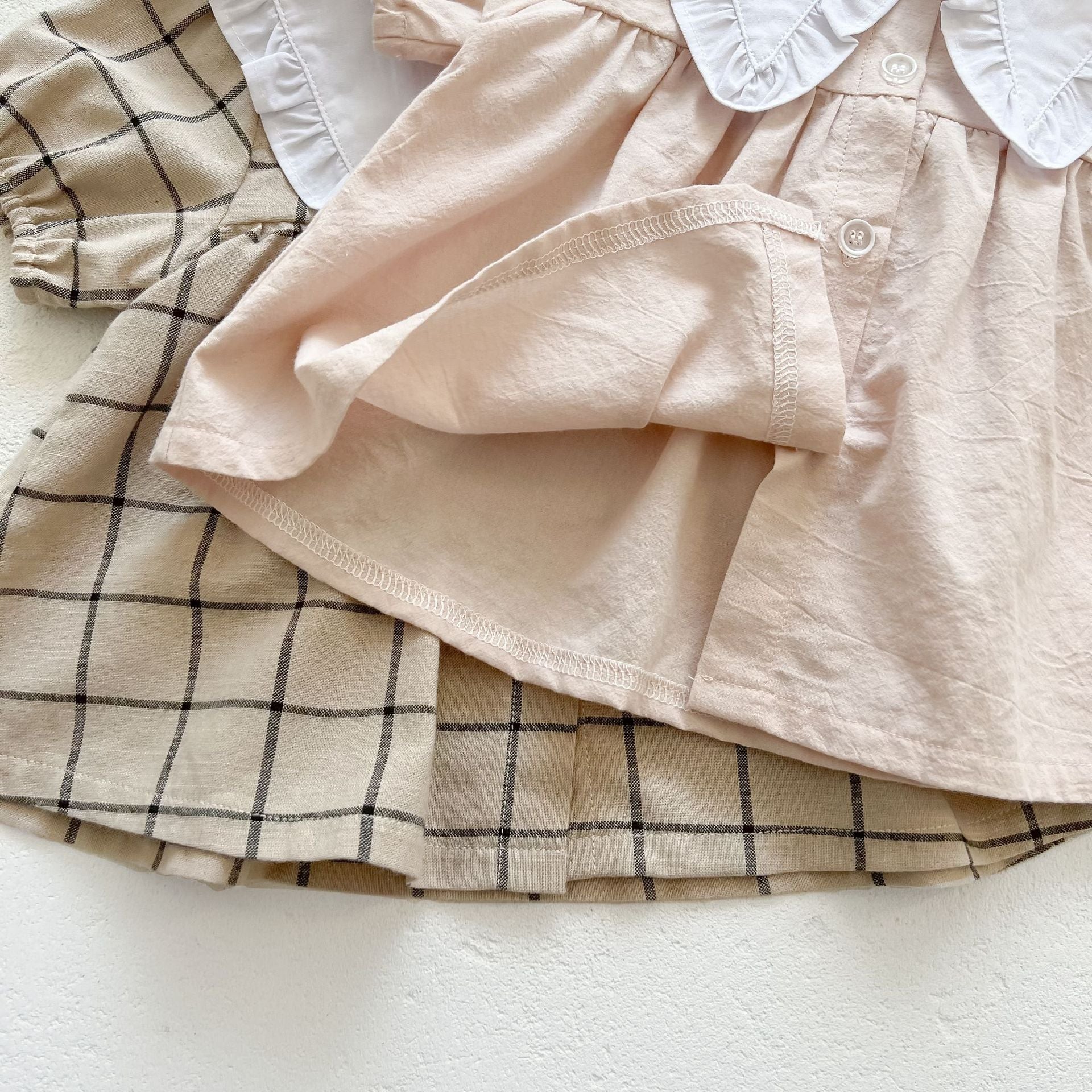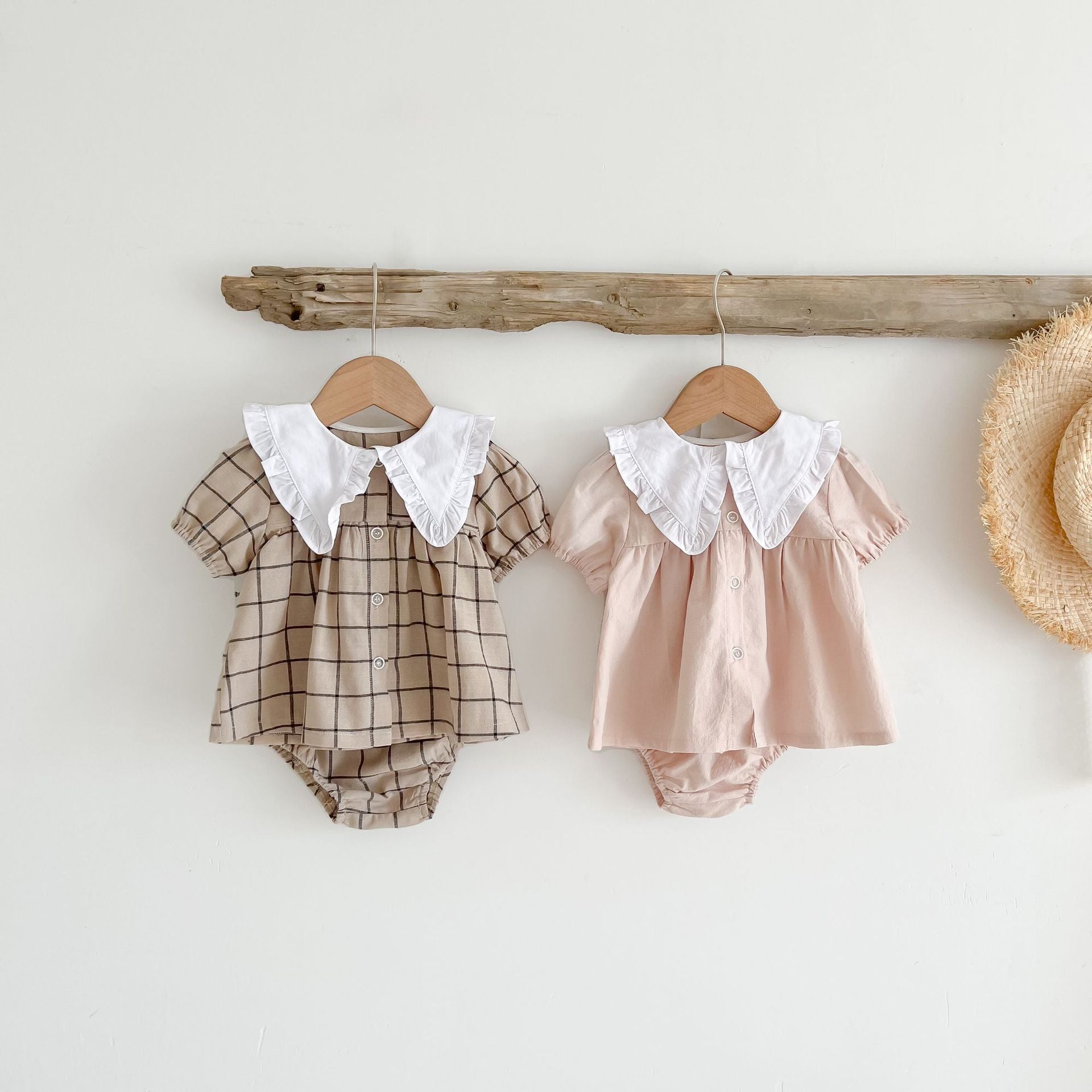 Let your little one embrace effortless style with this exquisite set featuring a baby girl's lapel-collar short-sleeve top and matching short pants. Crafted from luxurious materials, this outfit will make a statement of classic elegance - perfect for special occasions or everyday wear!