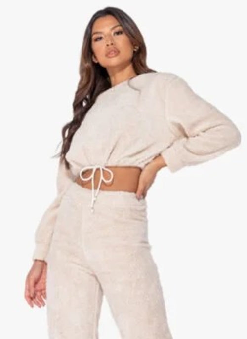 BEIGE TEDDY BORG CROPPED TOP & JOGGER LOUNGE SET