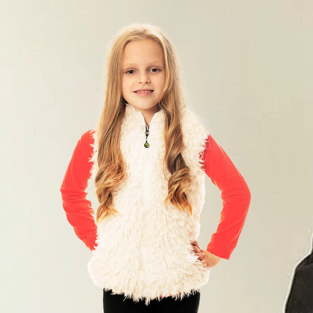 It is a stylish cream-colored faux fur vest layered over a bright red long-sleeve shirt. Her confident pose, with hands on her hips, highlights the fashionable and cozy look. The vest adds texture and warmth, making it an ideal outfit piece for cool weather and casual outings.