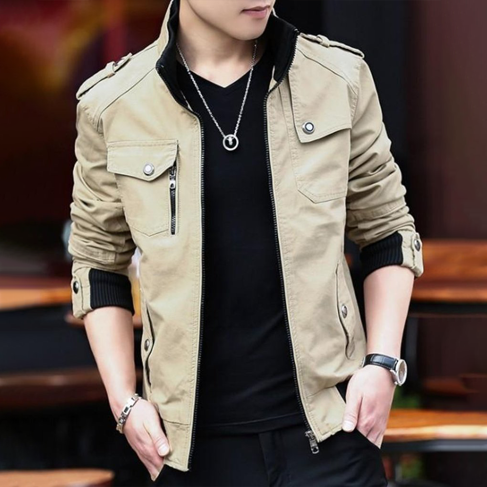 The men's army-style zipped-up jacket comes in army green, black, and beige. Made with top-quality material and suits everyday wear. This best-selling military-theme short jacket is made with top-quality material and can easily be your daily outfit. Whether it's jeans or casual pants, this jacket can easily match your outfit.