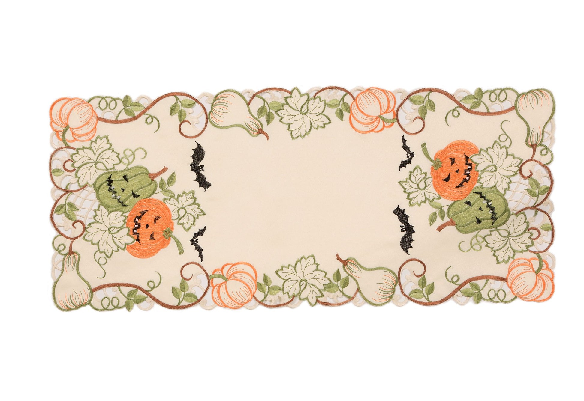 Add an element of spooky fun to your Halloween table settings with these festive table linens. Halloween happy jack-o-lanterns are rendered in embroidery and cut work on ivory fabric. A spooky and festive accent to your Halloween gatherings.